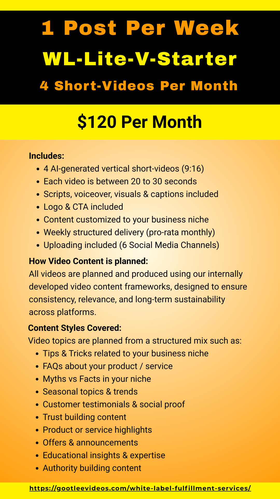 - WL-Lite-V-Starter – 1 Post Per Week (4 Videos/month) – $120 per month