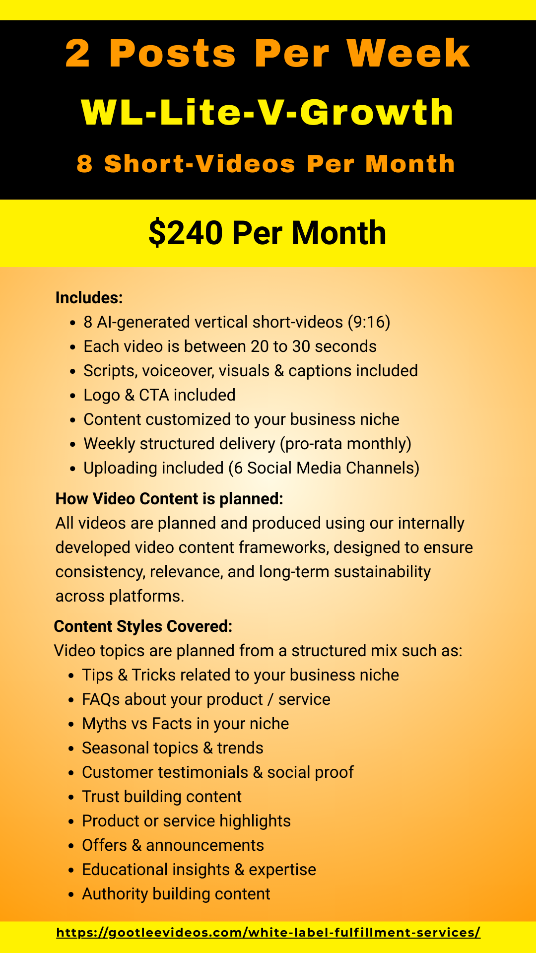 - WL-Lite-V-Growth – 2 Posts Per Week (8 Videos/month) – $240 per month