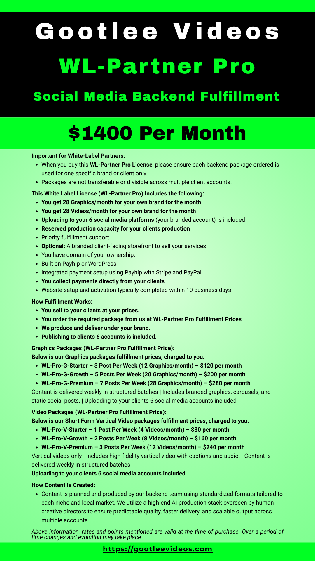 Below is our “WL Partner Pro” – Short Form Vertical Video packages fulfillment price for your clients.