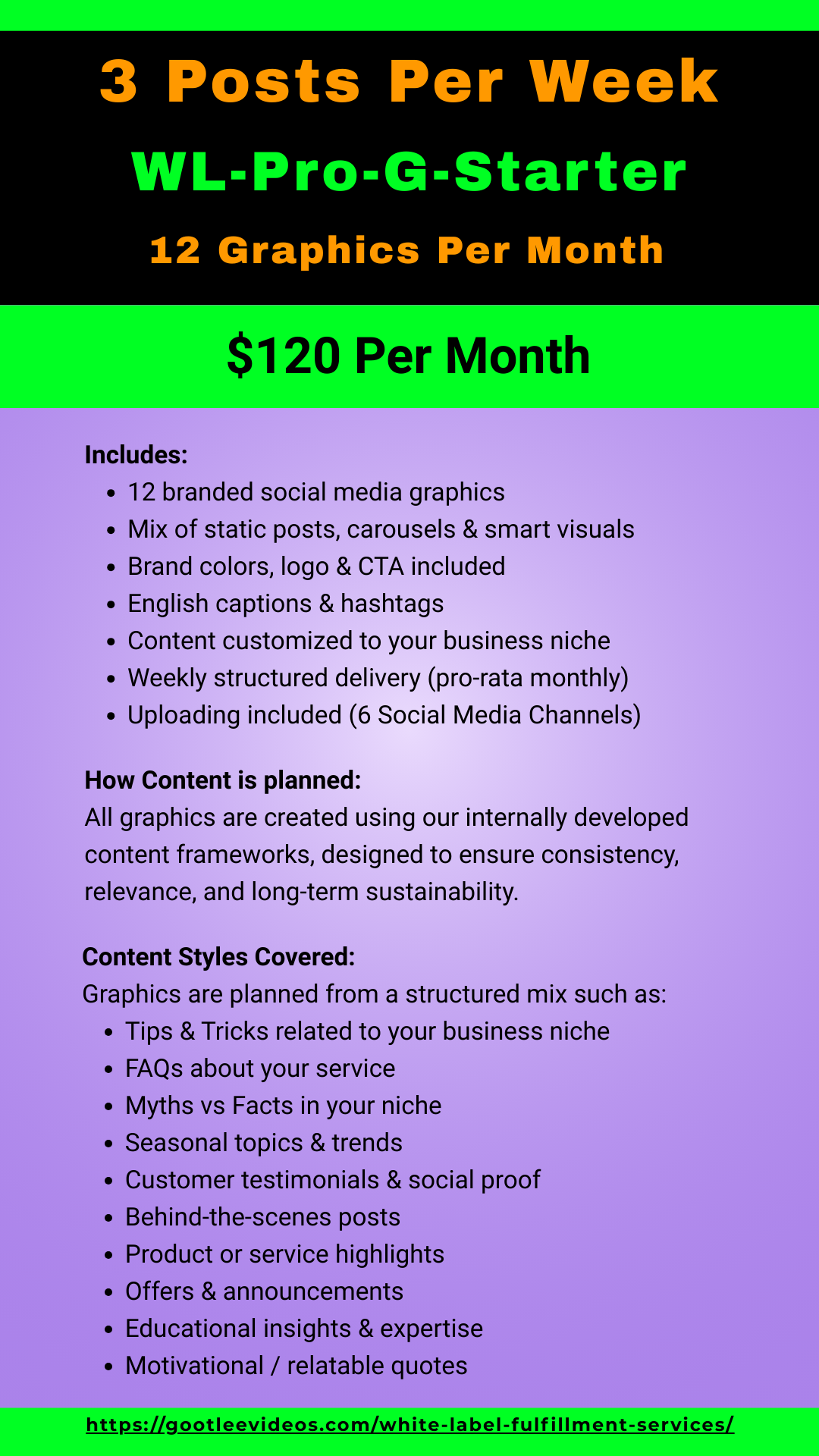 - WL-Pro-G-Starter – 3 Posts Per Week (12 Graphics/month) – $120 per month