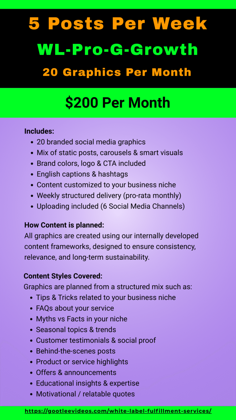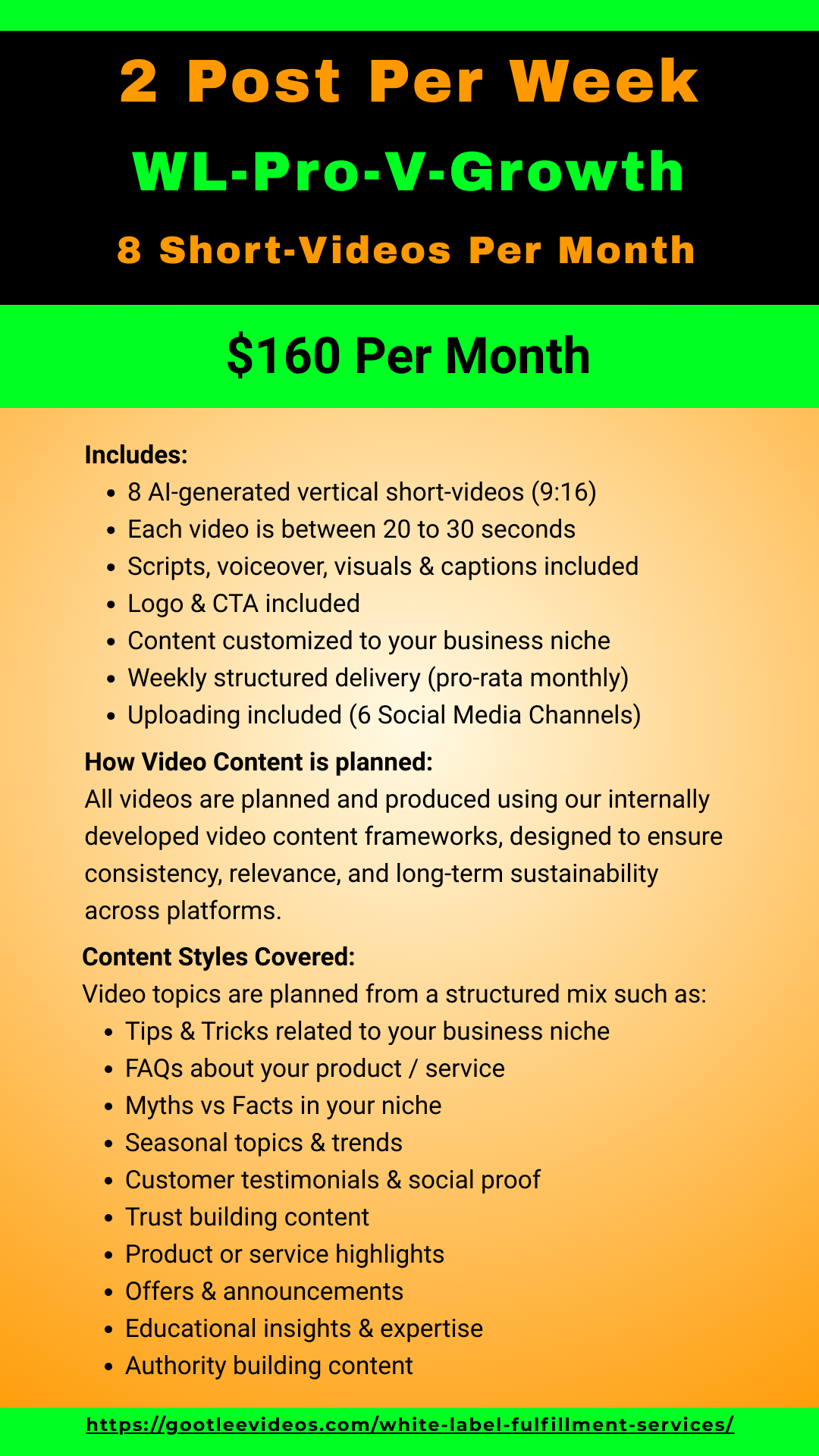 - WL-Pro-V-Growth – 2 Posts Per Week (8 Videos/month) – $160 per month