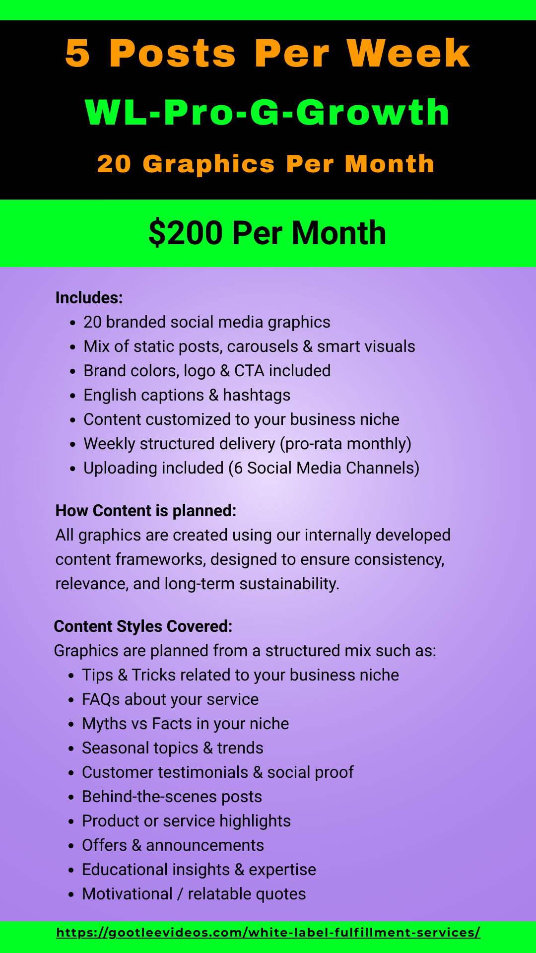 - WL-Pro-G-Growth – 5 Posts Per Week (20 Graphics/month) – $200 per month