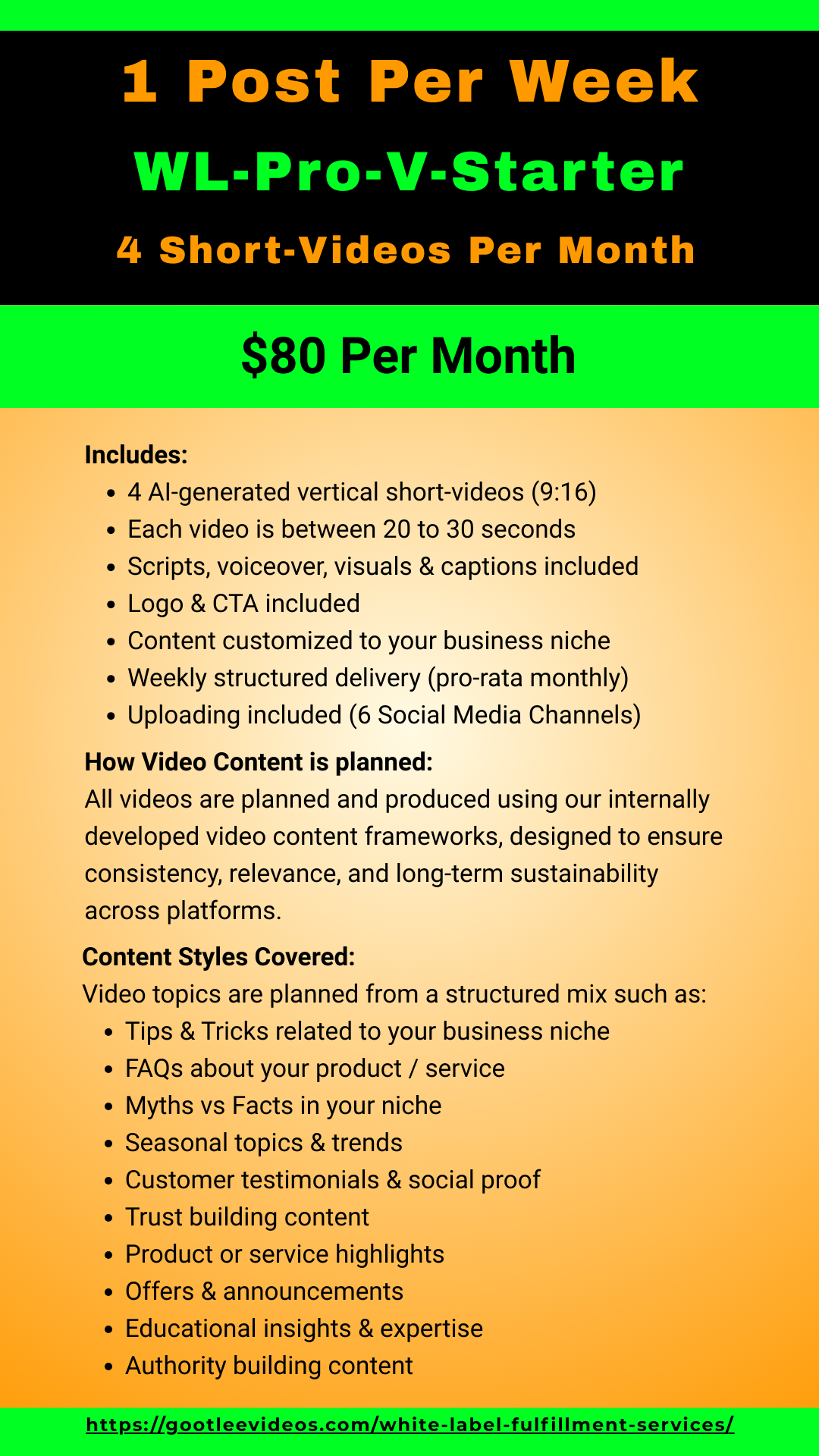 - WL-Pro-V-Starter – 1 Post Per Week (4 Videos/month) – $80 per month
